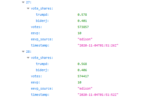 PedeInspector explains how he wrote a script to detail all the instances of votes being lost or switched from Trump to Biden. His data source is the NYT raw data dump feed at the following link (which may not function once the NYT pulls it):